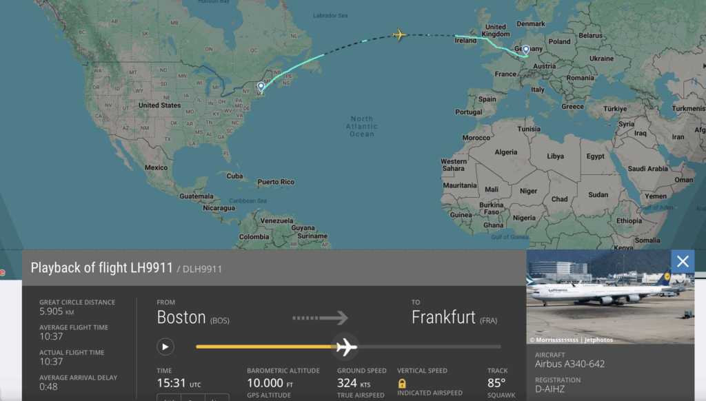 Dies verlangte eine niedrige Flughöhe, und der Airbus A340-600 flog die gesamte Strecke über den Atlantik auf gerade einmal 10.000 Fuß, was etwa 3.000 Metern Flughöhe entspricht. In diesen Flughöhen müssen Airliner aufgrund der höheren Dichte der Atmosphäre deutlich langsamer fliegen, sodass die reine Flugzeit von LH9911 bei 10:37 Stunden lag.