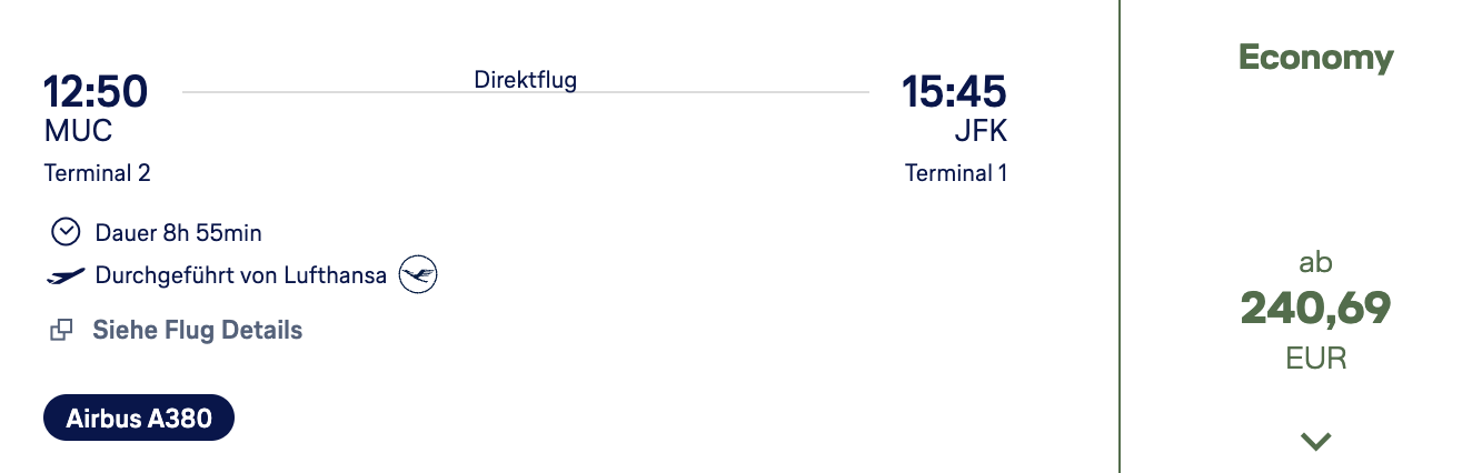 Bei diesem Deal handelt es sich zwar um einen Flug in der Economy Class, der Preis ist jedoch sehr niedrig. Der Start in München macht die Sache attraktiv. Ab dem Sommerflugplan setzt Lufthansa wieder den Superjumbo nach New York JFK ein. Für einen Aufpreis von knapp 100€ gelangt Ihr in den umbuchbaren Basic-Tarif mit Freigepäck. Vereinzelt gibt es auch Codeshare-Verbindungen mit anderen Partnern.