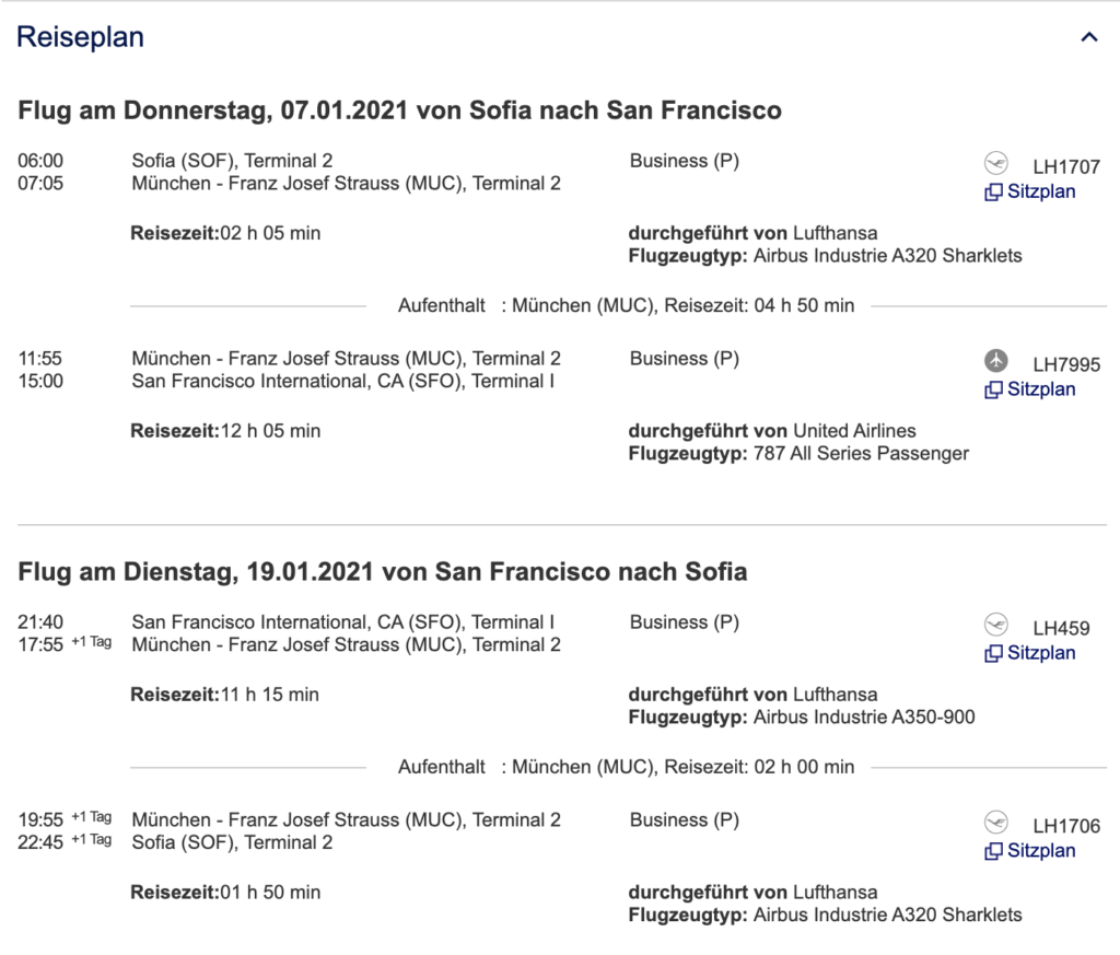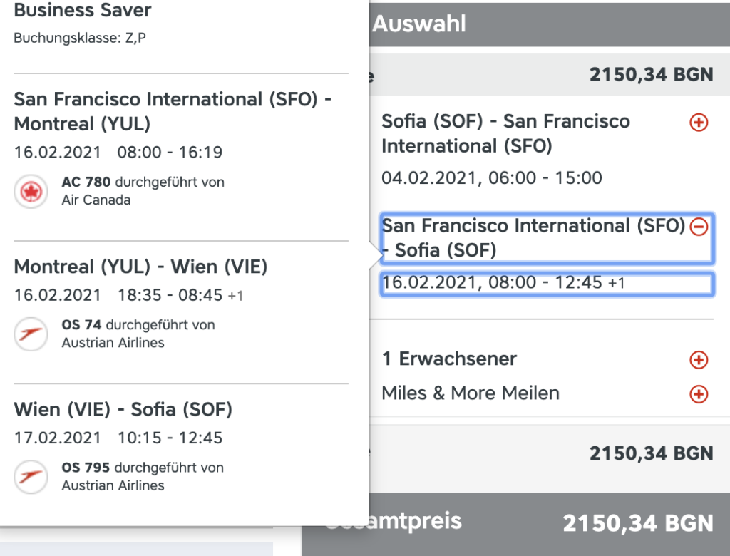 Auch bei Swiss findet man die Angebote direkt auf der Homepage. Da Swiss nicht selbst von Sofia nach Zürich fliegt, erfolgt die Anreise beispielsweise über München. Teilweise werden die Flüge auch von United oder Air Canada durchgeführt. Eine gute Gelegenheit um deren Premiumprodukte zu testen!