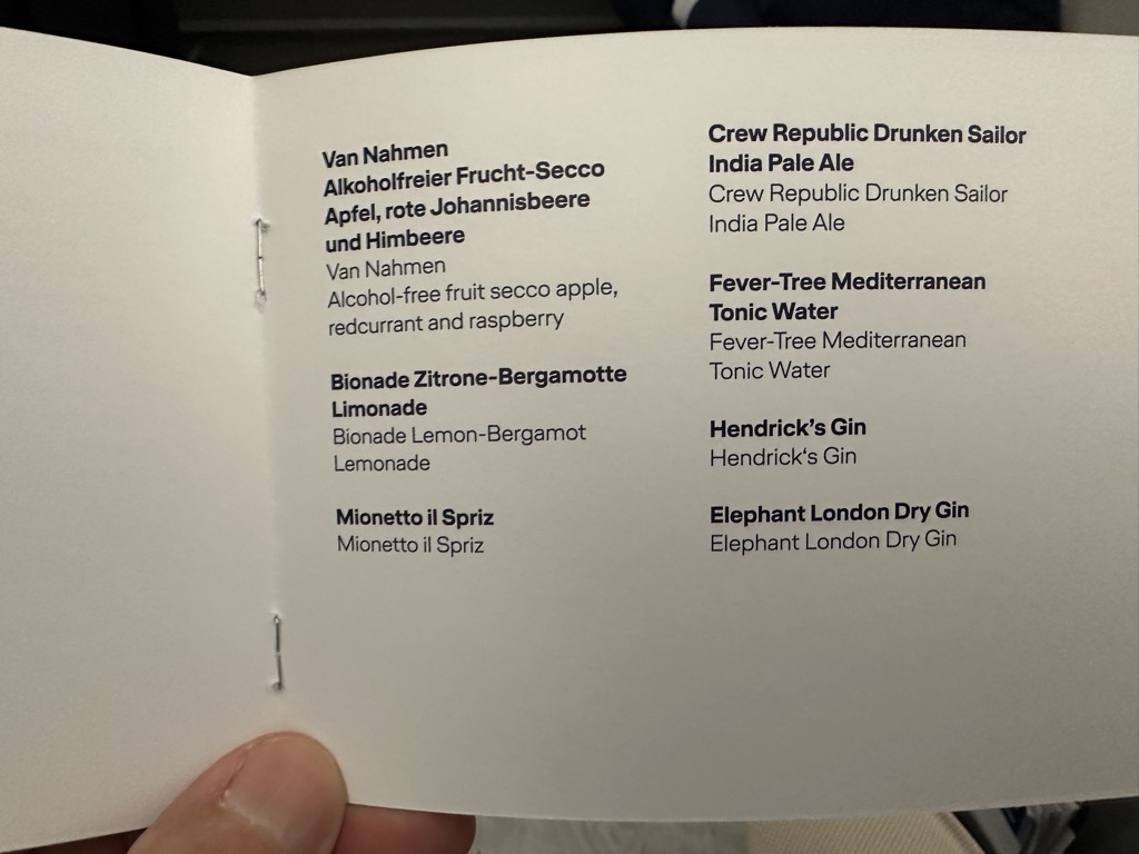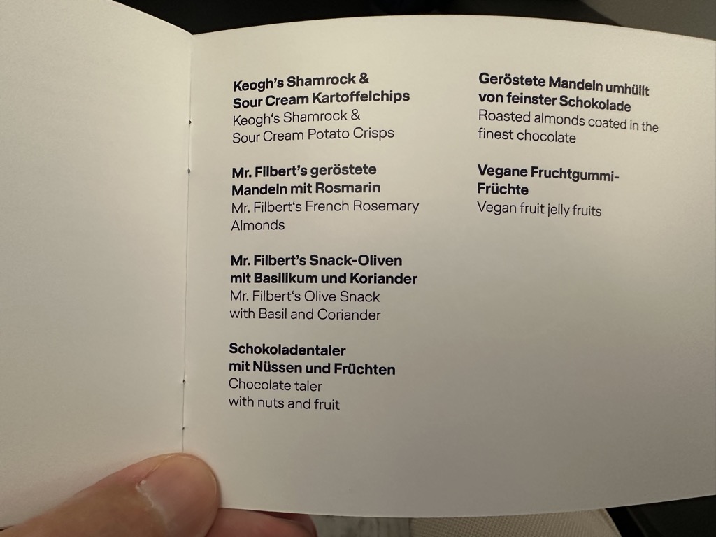 Hier hat Allegris natürlich keine besondere Stellung, daher halte ich das Thema Essen kurz. Die Vorspeisen waren gut (Vitello tonnato bei mir, Burrata bei meiner Frau), die Hauptspeise bei mir okay (Short Rib wegen extremem Zähneklebens schwer essbar, aber sehr leckeres Kartoffelpüree und Gemüse), bei meiner Frau eher mies (versehentlich vegetarisches Zürcher Geschnetzeltes bestellt, Rösti ist nichts für eine Flugzeug-Bordküche und wurde vorsorglich in Soße ertränkt). Alles andere wie gewohnt, außer dass es für die Business Suite Gäste noch eine kleine Extrakarte gab. Meine Meinung dazu: Das macht das ganze noch heterogener und komplizierter, tut das den Flugbegleitern nicht auch noch an! Der Kostenfaktor dürfte recht überschaubar sein, die Snacks allen Passagieren der Business anzubieten.