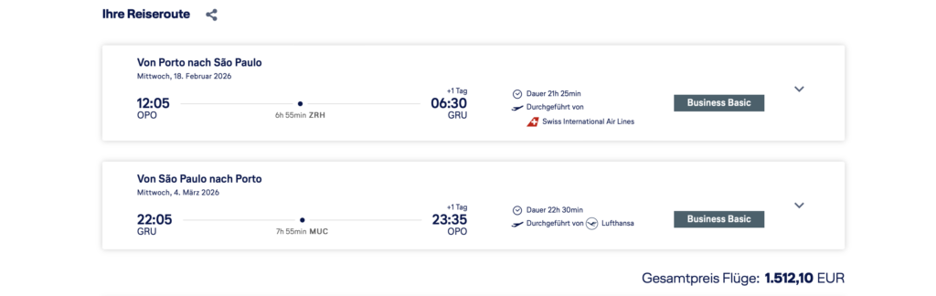 Wer hierzu aber bereit ist, der wird mit schönen Flügen zu einem fairen Preis belohnt und kann in der Lufthansa oder Swiss Business Class nach Sao Paulo fliegen.