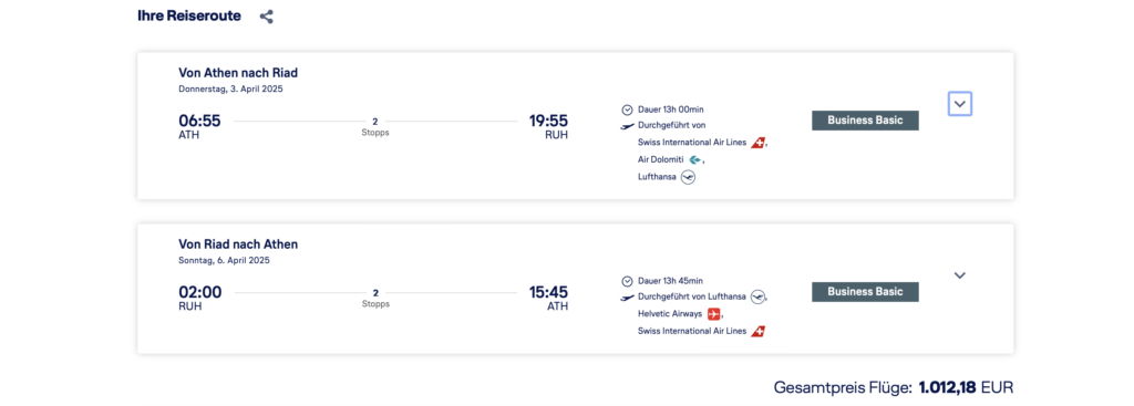 Dabei machen wir uns bei diesen Lufthansa Business Class Status Points Run die kürzesten Langstrecken von Lufthansa in den Nahen Osten zu nutze, welche aber nach dem neuen System in der Business Class genau so 200 Status Punkte bringen, wie ein Flug nach Argentinien oder Singapur. Passend dazu gibt es auch noch sehr günstige Angebote von Athen, über Frankfurt (und ggf. zusätzlich München oder Zürich) nach Riad.