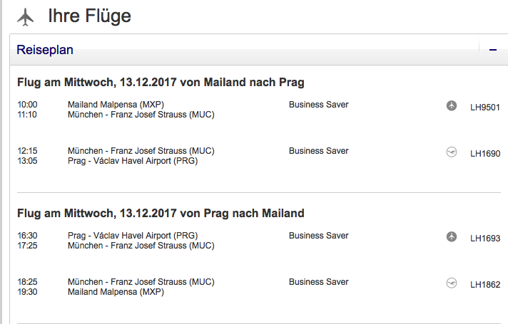 Der mit Abstand günstigste Tarif durch Europa in der Lufthansa Business Class (Buchungsklasse D) geht von Mailand nach Prag. Auch andere Strecken durch Europa funktionieren natürlich auf die selbe Art und Weise wie hier beschrieben, allerdings sind diese teurer.
