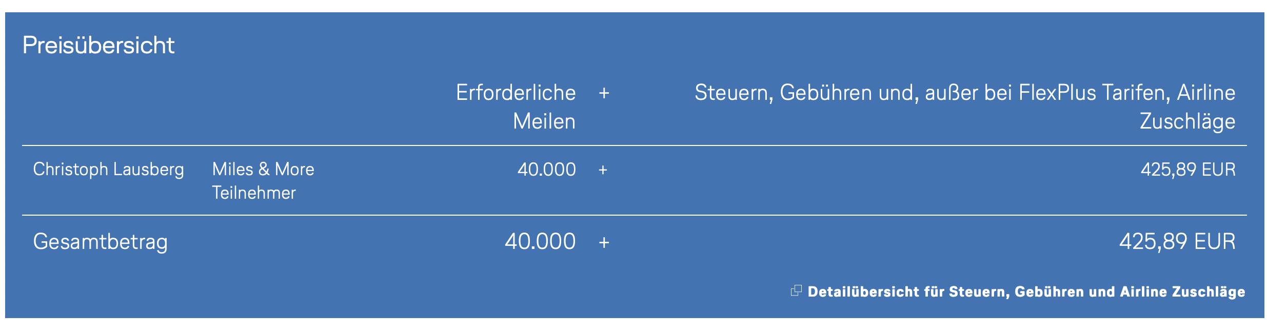 Zum Abschluss könnt Ihr dann die Flüge ganz normal buchen, wie jedes andere Flugticket auch. Hier fällt dann auch auf, warum wir nicht schreiben, dass man für 109 Euro einen Hin- und Rückflug nach Dubai in der Business Class buchen kann, auch wenn die 40.000 Meilen nur 109 Euro gekostet haben. Es fallen noch Steuern, Gebühren und Airline Zuschläge an, welche mit 425,89 Euro durchaus happig sind.