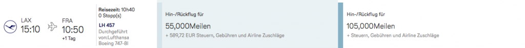 Der Flugpreis für einen bequemen Hin- und Rückflug in der Lufthansa Business Class liegt hier bei 55.000 Meilen und etwa 550 Euro bis 580 Euro Steuern und Gebühren.