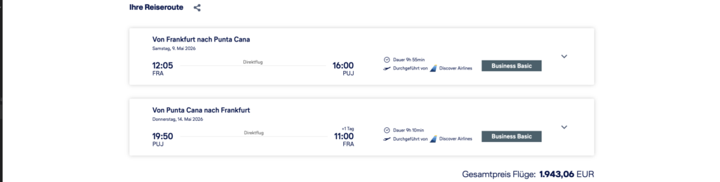 - Buchungsklasse: Business Class (P)