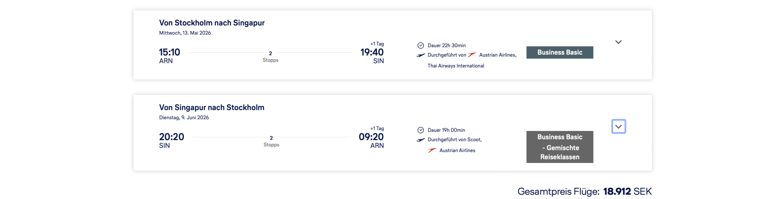 Verfügbarkeiten lassen sich grundsätzlich den ganzen Jahr über finden, allerdings können die Flugpreise je nach genauem Datum natürlich auch hier variieren, aber Schweden ist aktuell für Flüge nach Singapur ein sehr interessanter Startpunkt.