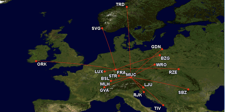 Besonders deutlich merkt man den Wegfall von Lufthansa CityLine natürlich auf den Strecken, die nur von der Regionaltochter geflogen worden sind und entsprechend nun im Lufthansa-Flugplan komplett wegfallen. Dies betrifft immerhin 15 Strecken, wobei nach Bydgoszcz, Cork, Rzeszów, Sibiu und Stavanger aktuell sogar keine andere Airline der Gruppe fliegt.