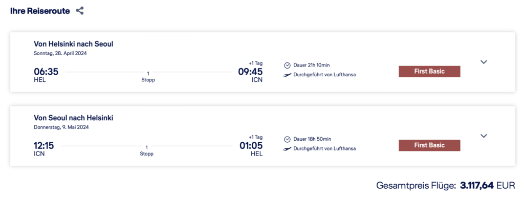Buchen kann man diese Angebote in der Lufthansa First Class im Sommer 2024, mit sehr guter Verfügbarkeit. Dabei eignet sich der Sommer nicht nur für eine Reise nach Korea, sondern Seoul ist auch ein guter Ausgangspunkt um zu anderen Orten in Fernost Asien, wie z.B. Japan weiter zu reisen.