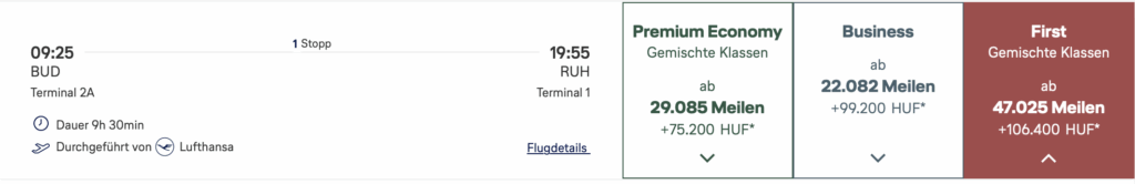 - Business Class 22.082 Meilen (258 Euro) und 248 Euro an Steuern und Gebühren = 506 Euro