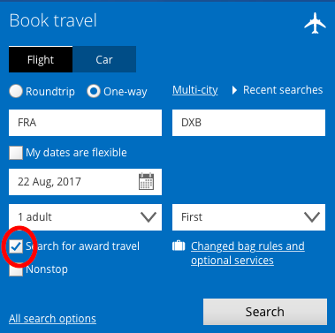 Gebt einfach in die normale Flugbuchungssuche Eure gewünschten Flüge und Daten ein und wählt „Search for Award Travel“.