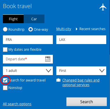 Gebt einfach in die normale Flugbuchungssuche Eure gewünschten Flüge und Daten ein und wählt „Search for Award Travel“.