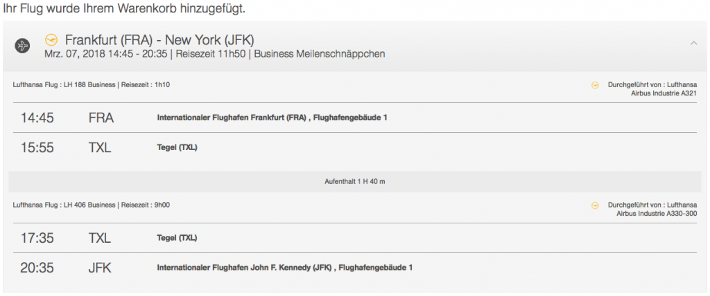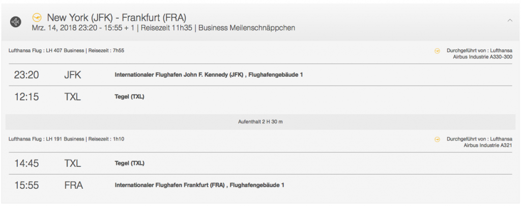 Dennoch kann man zwischen dem 01. März 2018 und 17. März 2018 auf quasi jedem Flug über Berlin Meilenschnäppchen in der Business Class nach New York buchen. Wichtig ist, dass Ihr darauf achtet, die Flüge LH 406/ 407 über Berlin TXL zu buchen, welche meist sehr weit unten aufgeführt werden, wenn Ihr nicht ab Berlin startet.