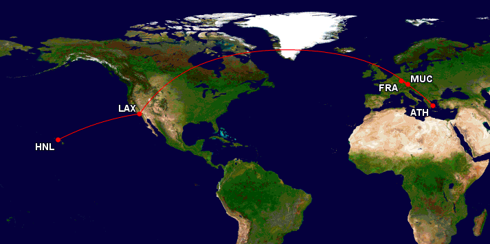 Hier könnte man von Athen über Frankfurt, München und Los Angeles einfach nach Hawaii fliegen.