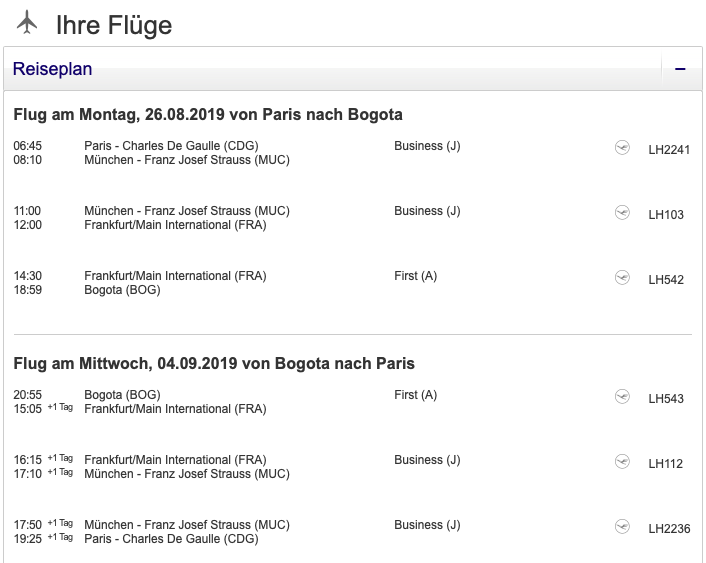 Ein meilenoptimiertes Routing würde wie folgt aussehen und führt Euch immer von Paris über München und Frankfurt nach Bogota. Der Flug von Frankfurt nach Bogota findet dann in der Lufthansa First Class statt, sodass Ihr auch schon am Boden in München die First Class Lounge und in Frankfurt das First Class Terminal nutzen könnt.