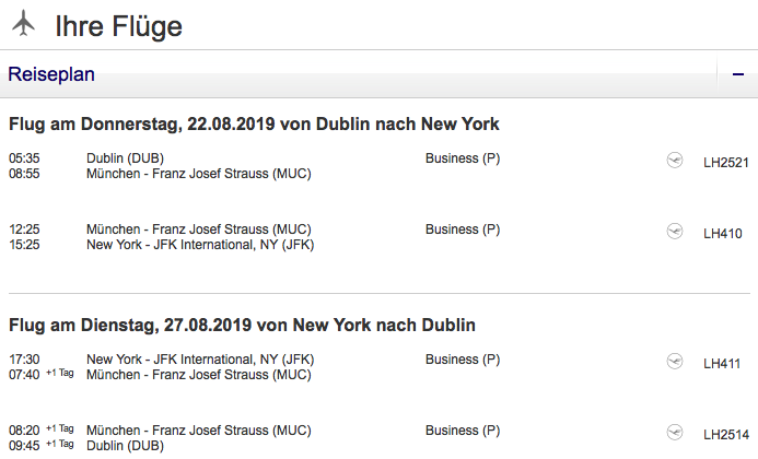 Beispiel eines Lufthansa Hin- und Rückfluges nach New York: