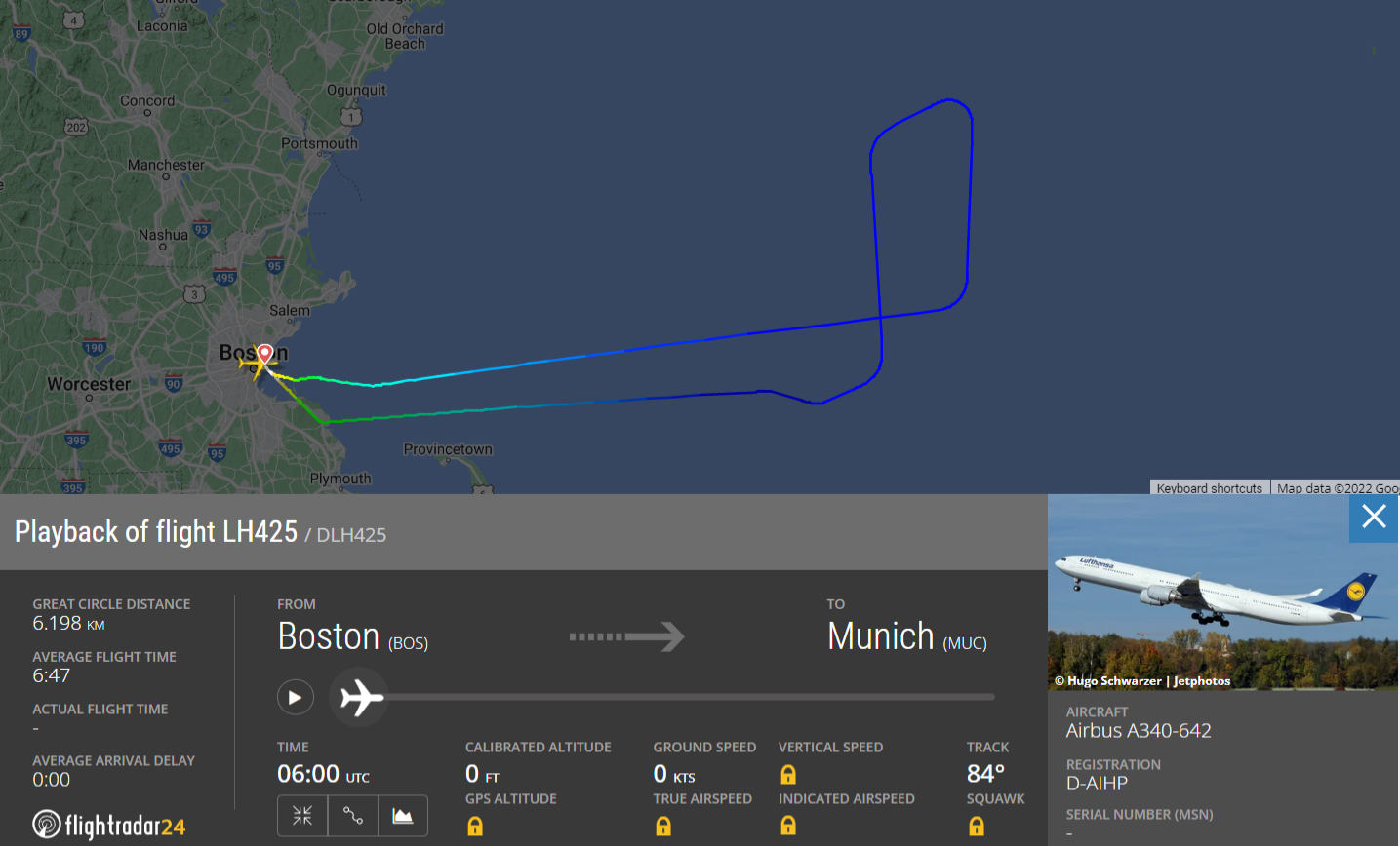 Das hatten sich die Fluggäste des Lufthansa Fluges LH425 am Dienstag, 8. November 2022 sicher anders vorgestellt. Sie rechneten fest damit am darauf folgenden Tag gegen 9:25 Uhr in München zu landen. Und so sah es zunächst auch aus, denn der Lufthansa Airbus A340-600 mit der Registrierung D-AIHP hob nur leicht verspätet am Flughafen Boston (BOS) ab.