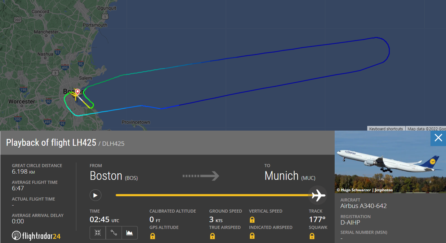 Etwa sechs Stunden und 45 Minuten dauert ein Flug von Boston nach München normalerweise. Und fast so lang waren Fluggäste am 8. November 2022 auch auf dem Lufthansa Flug LH425 unterwegs. Nur kamen Sie danach nicht in München an. Stattdessen kehrte der Lufthansa-Airbus A340 gleich zwei Mal an seinen Ausgangspunkt Boston zurück. Und blieb am Ende auch da, denn der Flug wurde anschließend gecancelled.