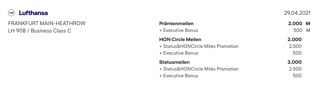 Hierbei bekommt man die doppelten Statusmeilen und den doppelten Executive Bonus von der Statusmeilen Promotion gutgeschrieben, sodass im Beispiel 2.000 Statusmeilen für den Flug + 500 Statusmeilen Executive Bonus + 2.500 Statusmeilen aus der Promotion, also in Summe 5.000 Statusmeilen gutgeschrieben werden.