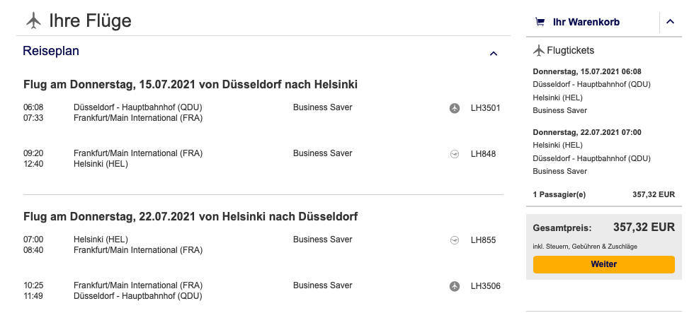 Noch einmal deutlich günstiger lässt es sich mit Lufthansas Business Class Angeboten durch Europa bewerkstelligen. So würde man mit einem Hin- und Rückflug nach Helsinki für 357 Euro in der bequemen Business Class reisen und sammelt auch noch 6.250 Statusmeilen.