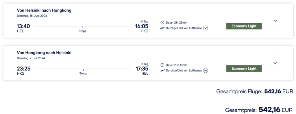 Dabei habt ihr rund 16 Stunden reine Flugzeit mit beiden Flügen und dürftet knapp 22 Stunden unterwegs sein. Wenn ihr für den angebotenen Preis fliegen wollt, geht es für Euch in der europäischen und anschließenden interkontinentalen Economy Class von Lufthansa nach Hong Kong. Der Rückflug erfolgt dann erneut via Frankfurt mit Lufthansa.