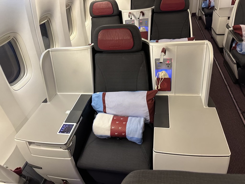 Auf allen Langstreckenflugzeugen hat Austrian Airlines einen Lie-Flat Business Class Sitz verbaut, wie man ihn zum Beispiel von der Swiss kennt. Auf den Boeing 767 sind die Sitze in 1-2-1 Konfiguration verbaut. In der 777 findet Ihr eine versetzte 1-2-1 und 2-2-2 Anordnung.