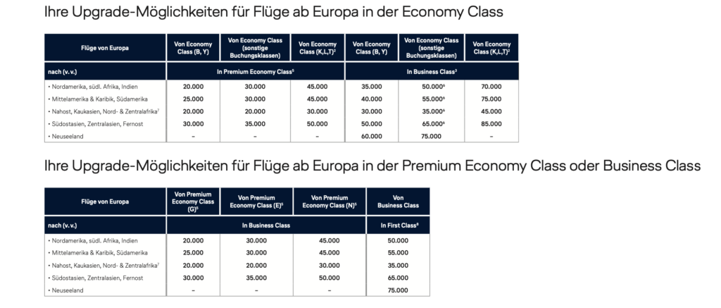 Dass die Meilenwerte für Upgrades aus den günstigsten Buchungsklassen erhöht wurden ist natürlich schade, aber auch nicht sonderlich überraschend, denn am Ende sind die Tickets in den Buchungsklassen K,L,T oder der Premium Economy Class N durchaus günstig. So kann man in der Buchungsklasse K auf Transatlantikflügen teils schon für unter 400 Euro für den Hin- und Rückflüge buchen und auch die Premium Economy Class Angebote in der Buchungsklasse N gab es schon ab 600 Euro, z.B. nach Dubai.