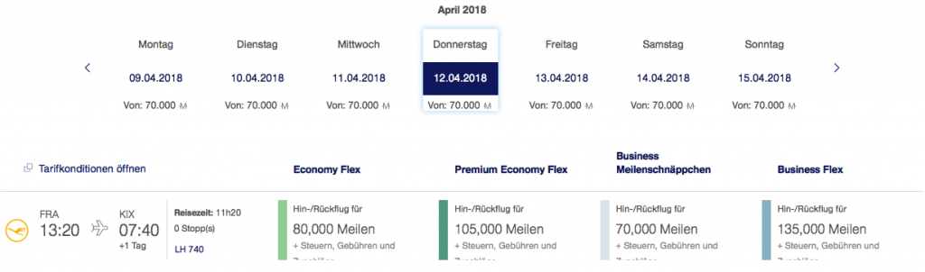 Osaka lässt sich momentan täglich im gesamten Reisezeitraum als Meilenschnäppchen in der Business Class Buchen.