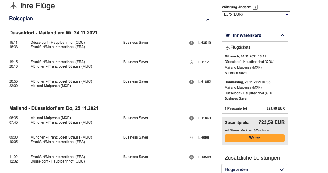 Ich finde keine Rückflüge von Mailand über München nach Frankfurt. LH zeigt mir nur Direktflüge an. Was mache ich falsch?