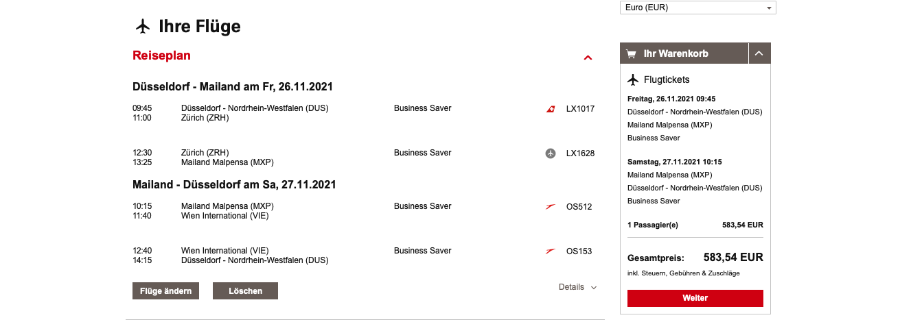 - Düseldorf- Zürich/Wien- Mailand und zurück mit 20.000 Meilen: 583 Euro