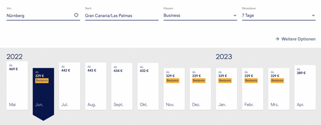 Lufthansa selbst hat einige sehr interessante Preise in der Business Class auf die Kanaren aufgelegt und diese beginnen bereits ab 349 Euro für den Hin- und Rückflug. Dabei bezieht sich dieser günstige Preis immer auf den Direktflug und auf Flüge in der günstigsten Buchungsklasse P. Die Flüge werden inzwischen oft von Eurowings Discover durchgeführt, auf die Meilengutschrift hat dies aber keinen Unterschied, egal ob man den Eurowings Discover Flug (4Y Flugnummer) oder einen Lufthansa Codeshare (LH Flugnummer) bucht.