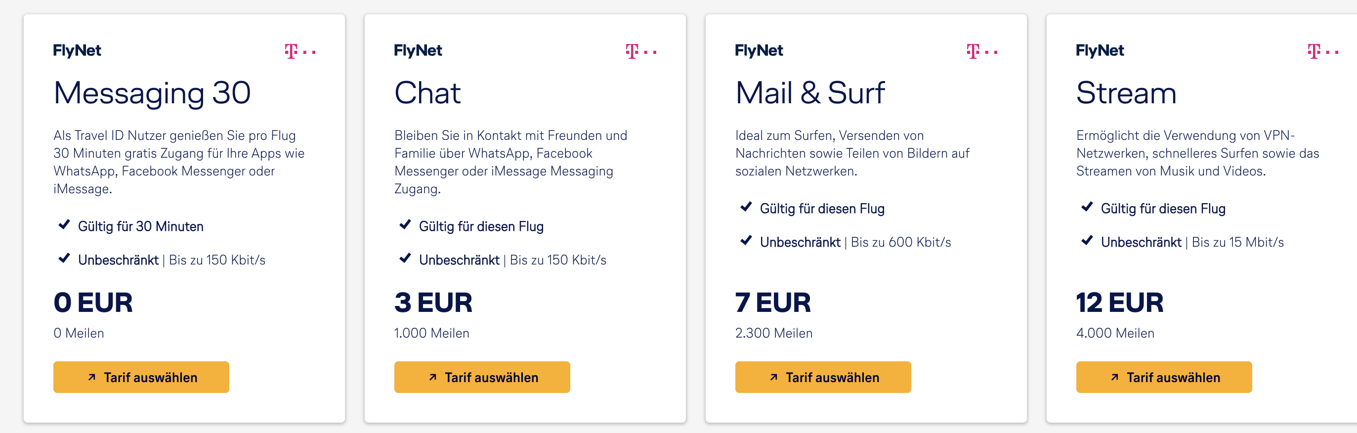 Derzeit können Lufthansa Passagiere auf Flugzeugen der Airbus A320 Familie mit Flynet den Chat-Tarif für 30 Minuten kostenfrei nutzen. Nutzer müssen sich hier mit der Travel ID einloggen, dann erscheint der vierte Tarif.