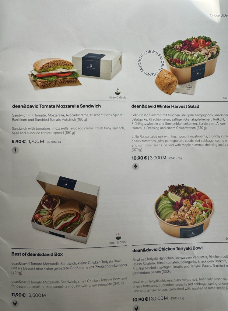 • Fleisch ist böse und weder Lufthansa noch Dean & David unterstützen übermäßigen Fleischkonsum. Und damit auch wir das lernen, werden fleischhaltige Gerichte nur noch sehr begrenzt offeriert. So, dass Du Dich schon schlecht fühlen sollst, wenn Du das bestellst.