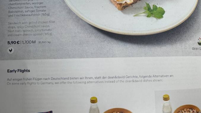 • Fleisch ist böse und weder Lufthansa noch Dean & David unterstützen übermäßigen Fleischkonsum. Und damit auch wir das lernen, werden fleischhaltige Gerichte nur noch sehr begrenzt offeriert. So, dass Du Dich schon schlecht fühlen sollst, wenn Du das bestellst.