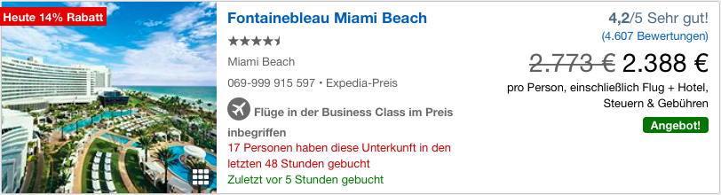Das legendäre Fountainebleau Miami Beach, lässt sich so für eine Woche im Dezember, inkl. Business Class Flug für 2.388 Euro pro Person buchen. Für Business Class Flüge und eines der besten Hotels in Miami Beach ist dies sicherlich ein HAMMER Preis!