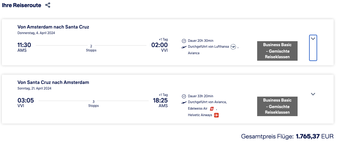 Das Business Class Special ab Amsterdam läuft nach wie vor, dabei könnt Ihr gute Angebote für Trips mit Lufthansa und deren Partner nach Südamerika finden. Einige Ziele in Bolivien sind derzeit schon ab etwa 1.500€ buchbar, die Verfügbarkeiten sind zum Teil auch für kurzfristige Reisen zu sehen.