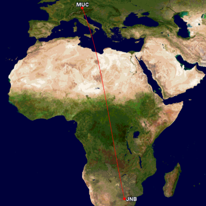 - LH578 | 19:30 Uhr München (MUC) – 07:05+1 Uhr Johannesburg (JNB) | Airbus A350-900XWB | montags, mittwochs, samstags