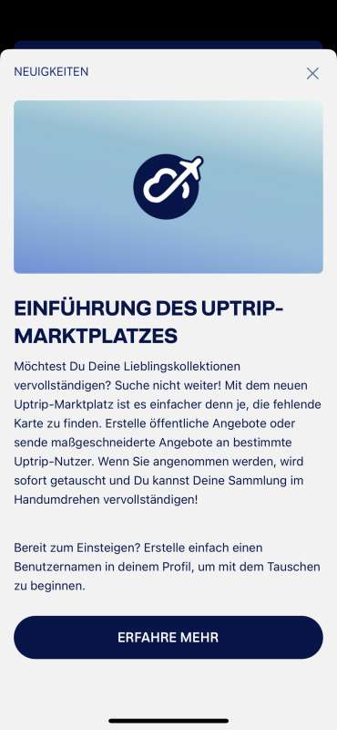 Seit dem Start der App war immer auch ein Marktplatz angekündigt, bei dem Ihr Eure Sammelkarten untereinander tauschen könnt, um schneller eine Kollektion aus unterschiedlichen Karten zu sammeln. Diese Funktion wurde nun endlich gestartet. Öffnet Ihr die Uptrip-App und drückt auf Marktplatz, öffnet sich die virtuelle Tauschbörse. Um loslegen zu können, müsst Ihr Euch noch einen Nutzernamen geben und bei Bedarf ein paar Infos in Euer Profil schreiben, was Ihr denn tauschen möchtet. Konkrete Angebote lassen sich dann sehr leicht erstellen.