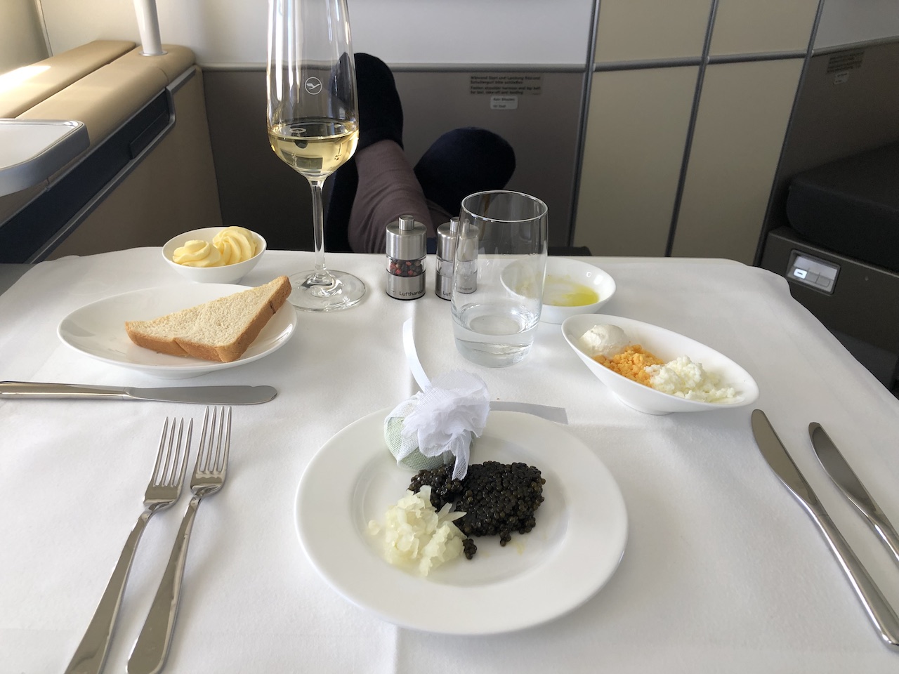 Hab nie verstanden, warum ich mir in der First mein Wunschessen nicht schon vor dem Flug auswählen kann. Ich bin eher bodenständiger Esser und brauche weder Kaviar, die ganzen Fisch- und Garnelenkomponenten und was da sonst noch so alles aufgetischt wird.