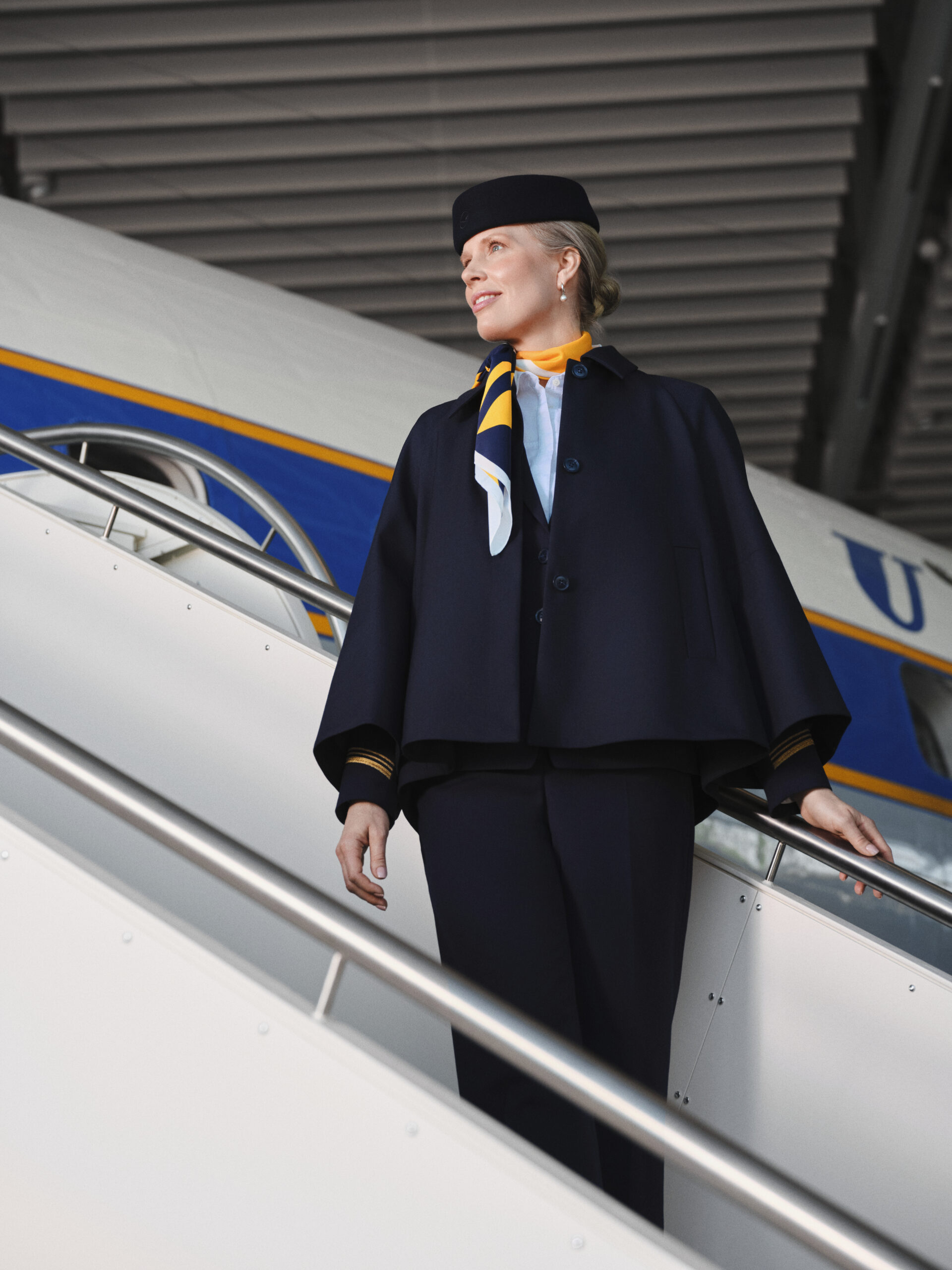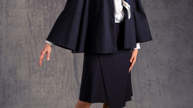 Die auffälligsten Neuerungen sind das Cape bzw. der Umhang (Beitragsbild), den sich die Stewardessen überwerfen können. Diesen gab es schon vor vielen Jahrzehnten, damals war er aber komplett in knalligem Gelb gehalten. Auf einigen Teilen wie dem Kleid sieht man auf den Schultern nun auch die Rangabzeichen.