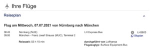 Auf der anderen Seite versucht LH die Busverbindungen so gut es geht einem Flug gleichzustellen, übernimmt das Risiko im Falle einer Verspätung und schreibt Meilen gut. Die Buchungsklasse wird in unserem Beispiel mit Y angegeben, was einem hochwertigen Economy-Tarif entspricht. Die Gutschrift wird allerdings mit nur 120 Meilen beziffert.