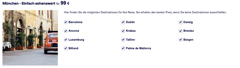 Hinter Lufthansa Surprise steckt eine Blind Booking Option, die schon seit mehreren Jahren angeboten wird. Hier sind günstige Tickets auch kurzfristig buchbar. Reisen in der Economy Class sind ab 99 Euro zu haben, die Tarife in der Business Class starten bei 199 Euro (Hin- und Rückflug). Es handelt sich dabei immer um Direktflüge, der Start erfolgt in Frankfurt (FRA) oder München (MUC). Die Destination wird Euch aber erst am Ende der Buchung mitgeteilt, dadurch könnt Ihr Euch aber dann zumindest auf das Ziel freuen und entsprechend vorbereiten.
