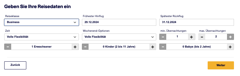 Im nächsten Schritt geht es an die Reisedaten, erst hier könnt Ihr die Reiseklasse auf Business umstellen, bei entsprechender Verfügbarkeit liegt der Preis dann bei 199€.