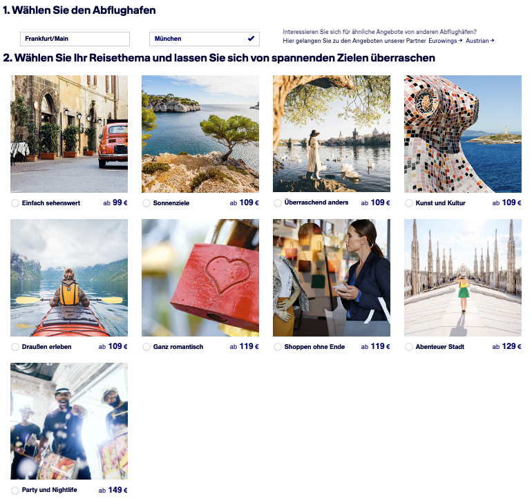 Die Destinationen sind in mehrere Kategorien unterteilt, die günstigste heißt „Einfach sehenswert“. Die Preise der anderen Reisethemen steigen auf bis zu 299 Euro, die teuerste Kategorie heißt „Party und Nightlife“. Bei „Einfach sehenswert“ werden derzeit neun mögliche Ziele für 199€ angezeigt. Einzelne Städte können auf der entsprechenden Surprise Website weggeklickt und somit ausgeschlossen werden, dadurch steigt aber der Preis an.