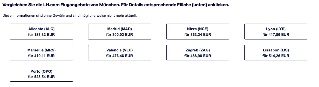 Ab München (MUC) stehen derzeit 39 Ziele in den vier Kategorien, die für 109 Euro buchbar sind: