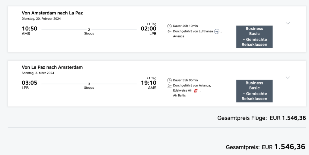 Dabei habt ihr rund 17 Stunden reine Flugzeit und dürftet mehr als 24 Stunden unterwegs sein. Wenn ihr für den angebotenen Preis fliegen wollt, geht es für Euch in der europäischen und anschließenden interkontinentalen Business Class von Lufthansa oder SWISS nach Bolivien.