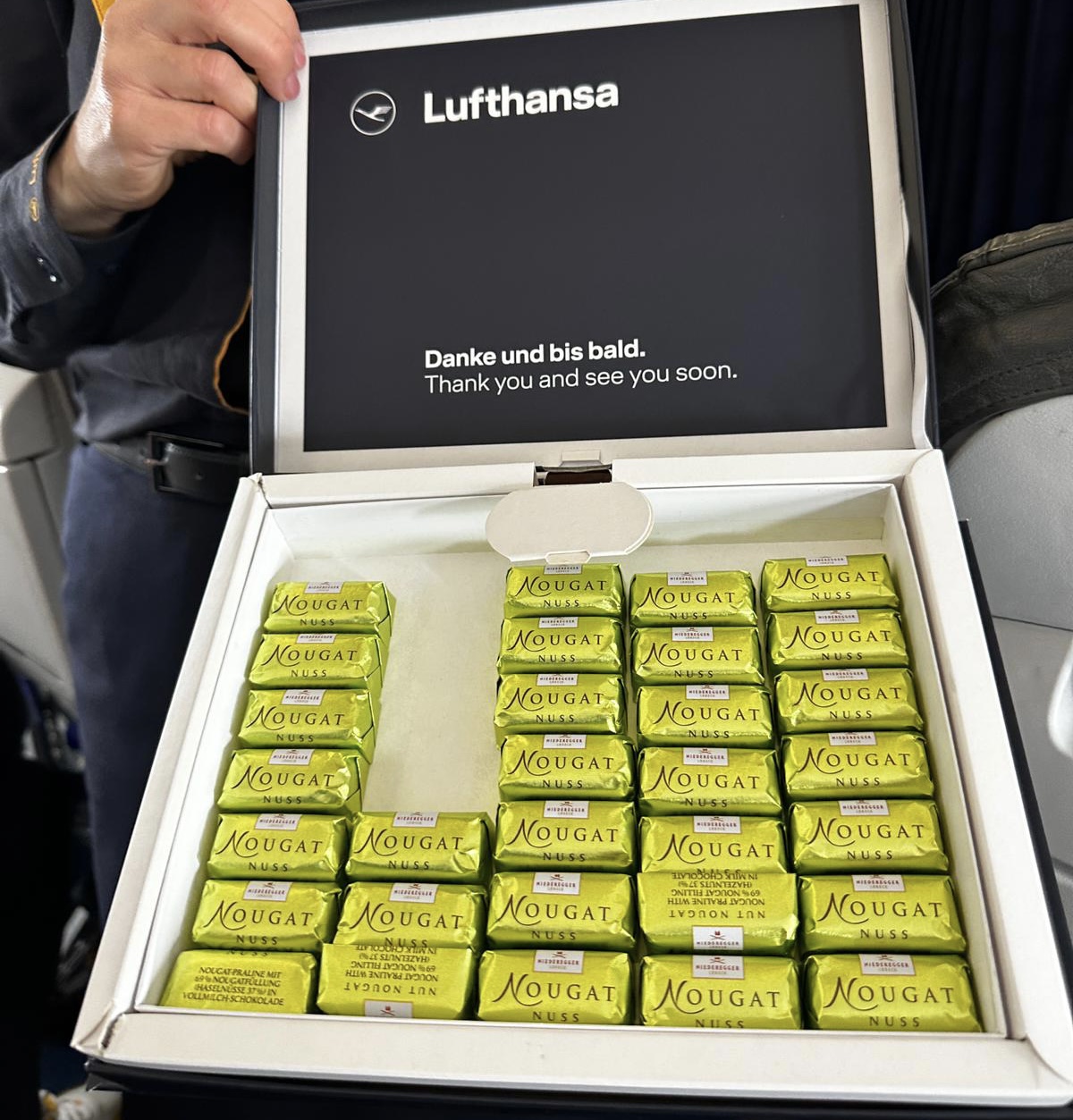 Wie es schient ist der fast schon legendäre Tasting Heimat Apfel von Lufthansa nun aber Geschichte, denn auf meinen letzten Lufthansa Flügen sind die Flugbegleiter am Ende eines jeden Fluges mit einer großen Schachtel Nougat Pralinen durch die Business Class Kabine gegangen.