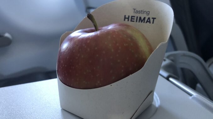 Unter dem Namen „Tasting Heimat“ hat Lufthansa vor einem Jahr ein neues Catering Konzept auf der Kurz- und Mittelstrecke eingeführt, bei welchem man die Passagiere in der Business Class mit wechselnden traditionellen Gerichten aus verschiedenen Teilen Deutschlands beglücken wollte. Teil des neuen Konzeptes war auch ein Apfel der zum Ende des Fluges gereicht wurde.