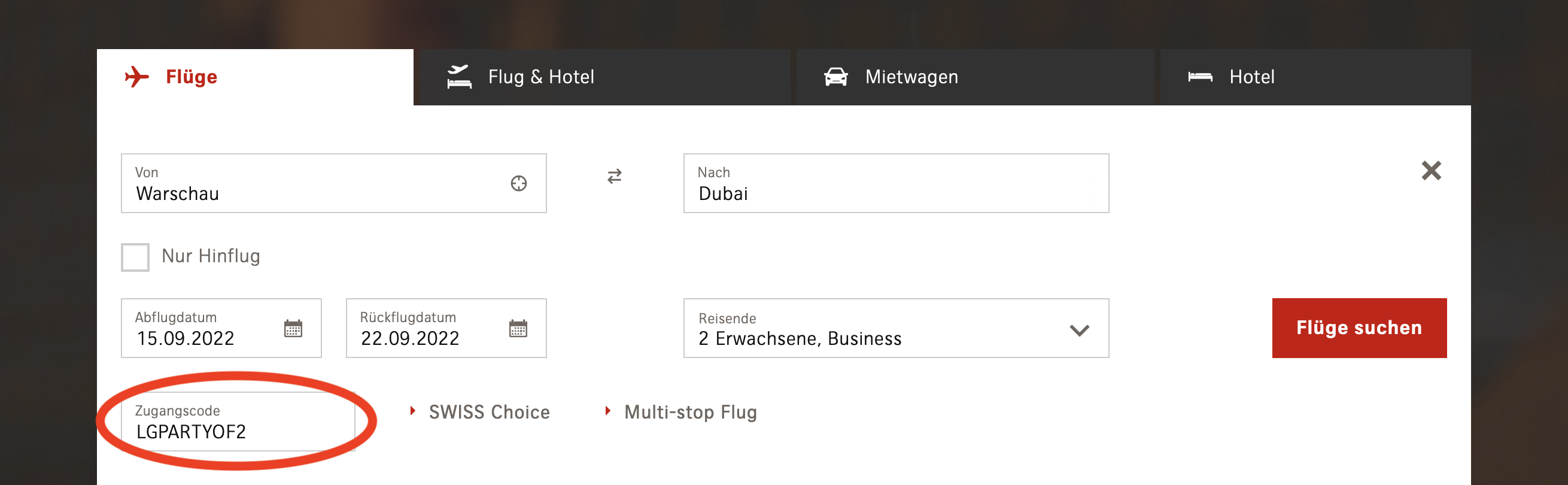 Die Buchung dieser Angebote ist grundsätzlich sehr einfach, wenn man sie denn kenn. Hierfür muss man am besten über die Swiss Webseite gehen und Warschau nach Dubai für mindestens zwei Personen in der Business Class suchen. Wichtig ist, dass Ihr den Code „LGPARTYOF2“ eingebt, da Euch sonst die günstigen Partnerangebote NICHT angezeigt werden!