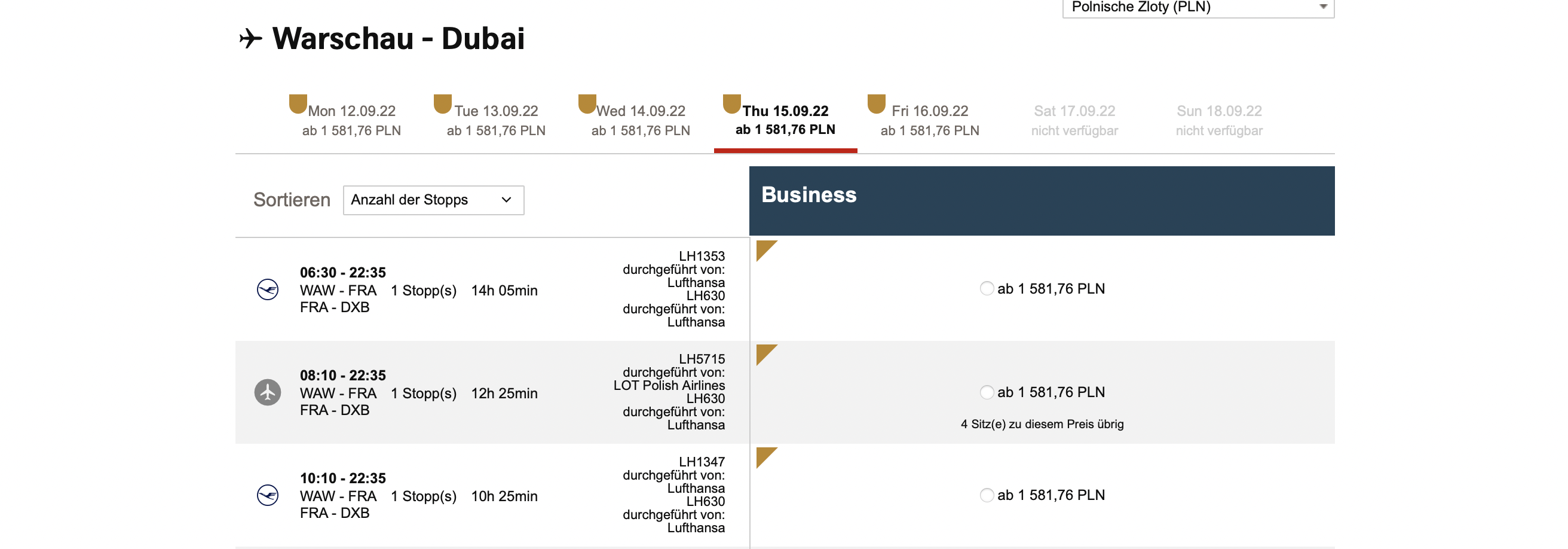 Anschließend könnt Ihr die günstigen Partnertarife direkt auswählen. Hierbei ist die Verfügbarkeit vor allem in der zweiten Jahreshälfte bereits sehr gut. Die Preise werden Euch in Polnischen Zloty angezeigt, wobei 1581 PLN etwa 348 Euro für den Hinflug pro Person entsprechen, wie Ihr auf dem Screenshot seht.